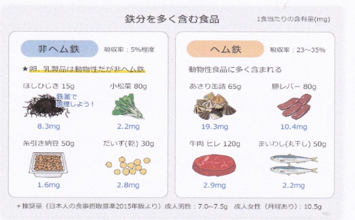 鉄分にはヘム鉄(動物性食品)非ヘム鉄(植物性食品)がありヘム鉄の方が吸収率高い。